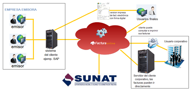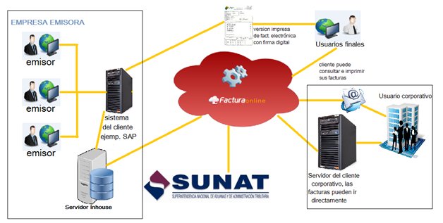 En este esquema, FACTURAONLINE se integra con el sistema del cliente para que cuando se emite una factura, su servidor se comunica con FACTURAONLINE que está en la nube y éste registra la factura en el servidor de SUNAT, luego devuelve la confirmación al sistema del cliente.